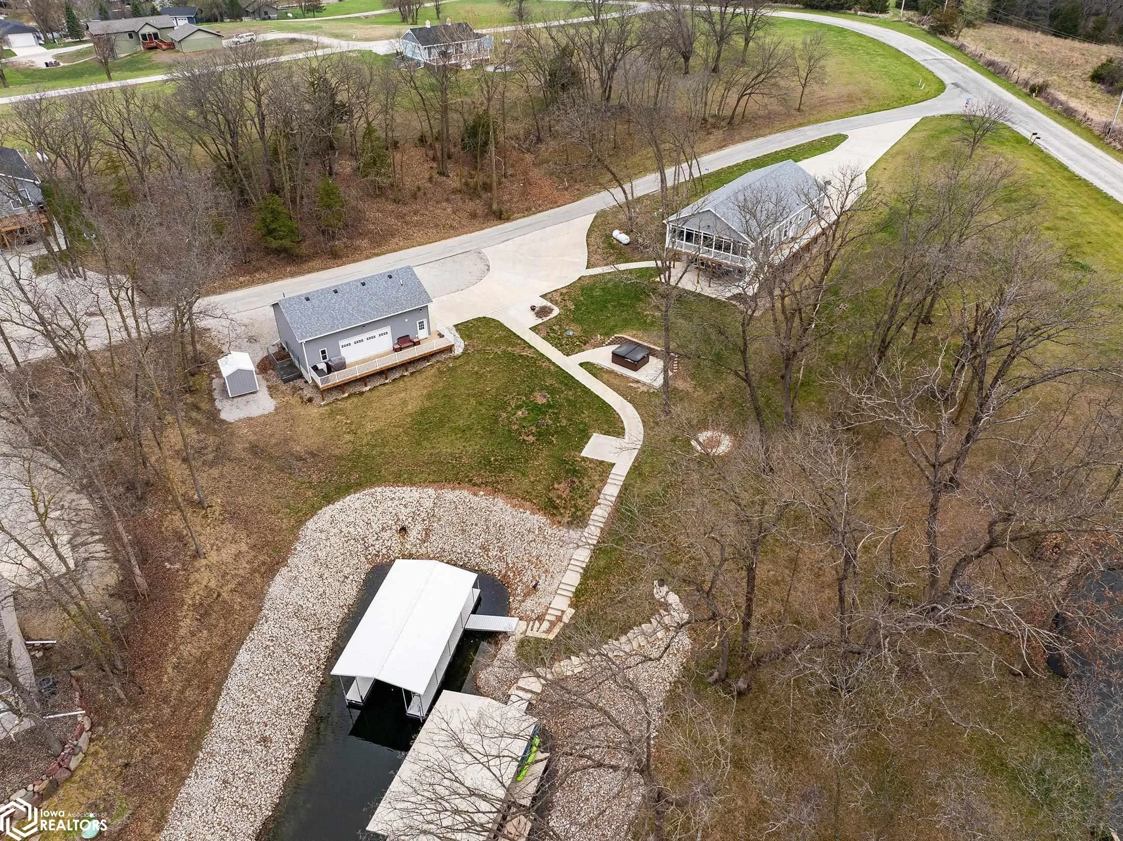 This one-of-a-kind property boasts an exceptional location, featuring the chance to own your own private inlet with 377.62 feet of shoreline, ensuring privacy in a park-like environment while providing protection for the boat on the floating dock system, complete with jet ski lift. The lake residence spans an impressive 36,937.40 square feet, offering ample space between properties and an abundance of parking. This stylish lake home showcases open-plan living areas and generous storage! Key features include:9-foot ceilings on both levels, Kitchen with sliding doors leading to a screened-in deck Four bedrooms, including a primary bedroom with an en-suite bathroom featuring an open, tiled shower, Three bathrooms in total, Lower-level kitchenette and family room, Additionally, this lake home provides dedicated spaces for everyone, including: A screened-in patio A lower patio, A fire pit sitting area A hot tub A versatile party garage with epoxy floors, two commercial garage doors, winter heating, an extra bathroom, and a lakeside deck. The property has been meticulously maintained and features numerous concrete pathways, and extra storage shed and is conveniently located near the beach. Opportunities like this are rare, so call today!