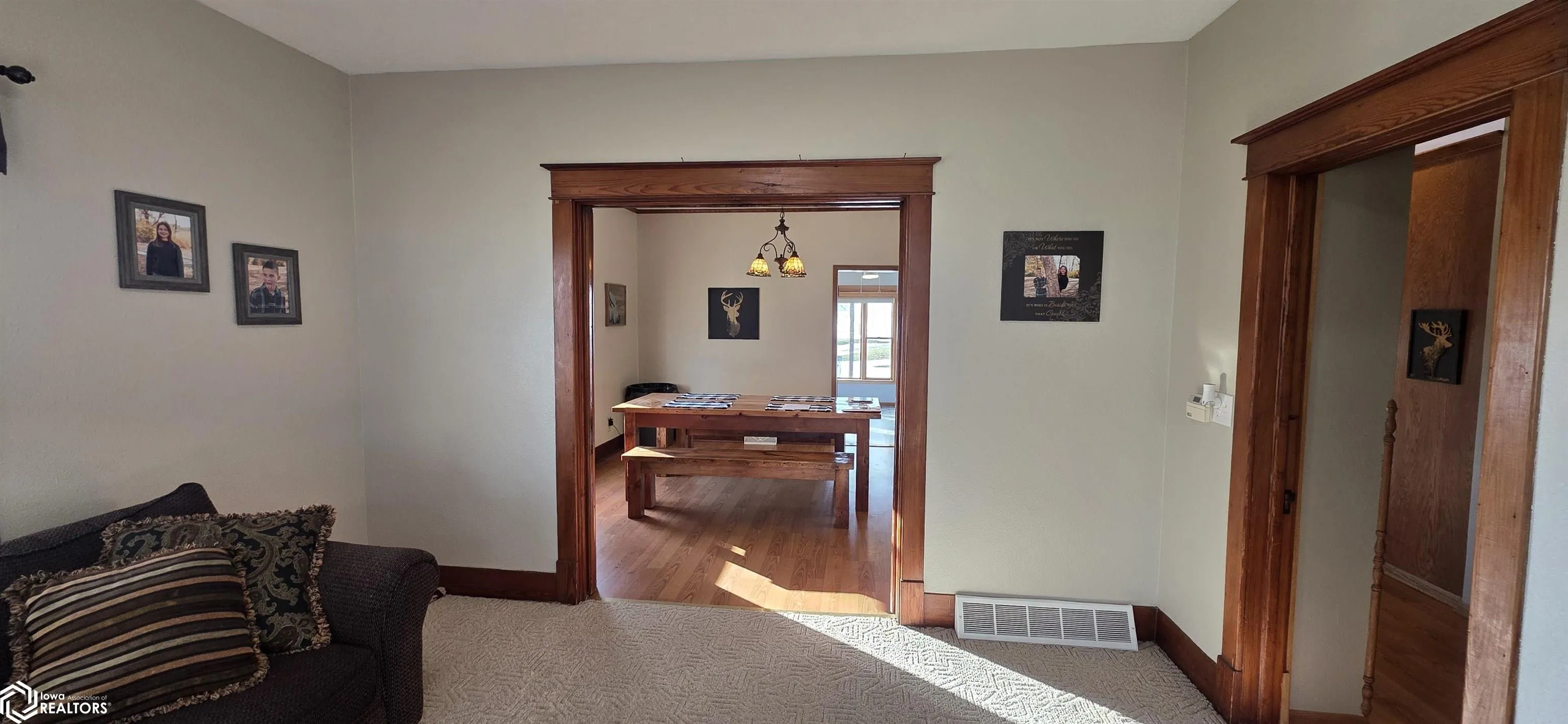 Nestled in the scenic vistas of eastern Adair County, this picturesque acreage combines the airy, rustic charm of country life with the convenience of its location. The spacious two-story farmhouse has been updated and renovated with all the conveniences and efficiencies of modern living, from the solid wood wraparound kitchen, to the geo-thermal heating and cooling. The main floor features a large mud room/entry space, a dedicated dining area just off the kitchen, and an extensive living room with some high ceilings. The craftsmanship is both old and new, as the home features extensive original woodwork throughout. Upstairs, you’ll find three bedrooms, and a full bathroom, with several built-ins and closet storage units. The basement comes partially-finished with a rec room that includes built-in shelves. The geo-thermal heating and cooling system is supplemented by a woodburner ducted directly into the heating system. Outside, you’ll find a large concrete parking pad directly behind the house, as well as a lovely patio covered by a pergola, affording an excellent place to relax and take in the natural beauty of the surroundings. The large pole shed/garage has three regular parking bays, as well as a fourth much taller bay able to accommodate a lawn tractor or similar equipment. Sit at YOUR dining room table, in YOUR living room, or in YOUR backyard, and take in life at its finest as you look over YOUR pond in this idyllic landscape.
